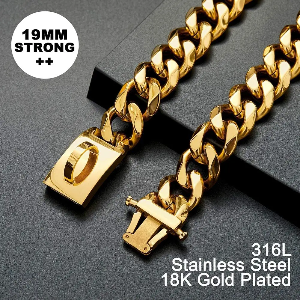 Steel dog chain: made of 316L stainless steel, with maximum strength and durability, 18K gold-plated, super strong dog collar, even if it bears 150 pounds (about 68 kg) of force, it will not be affected.