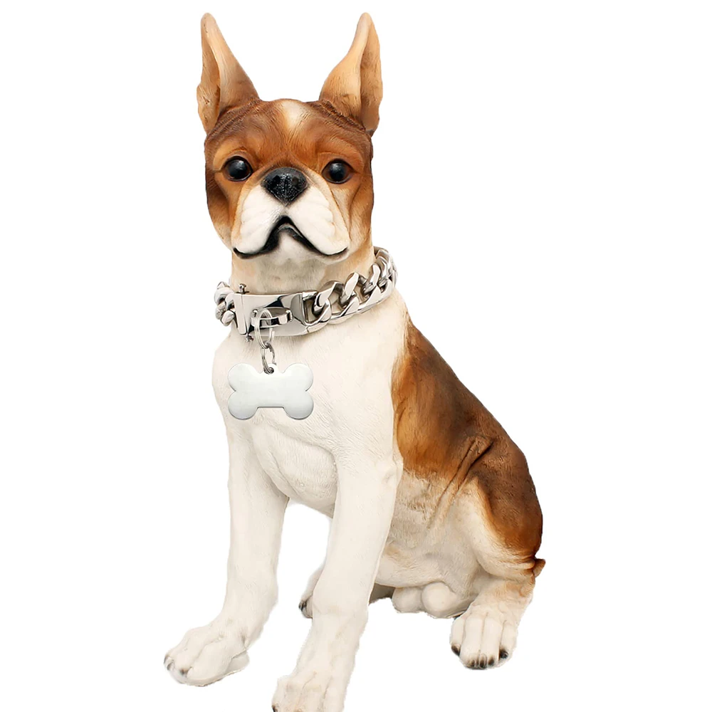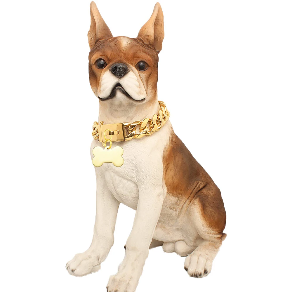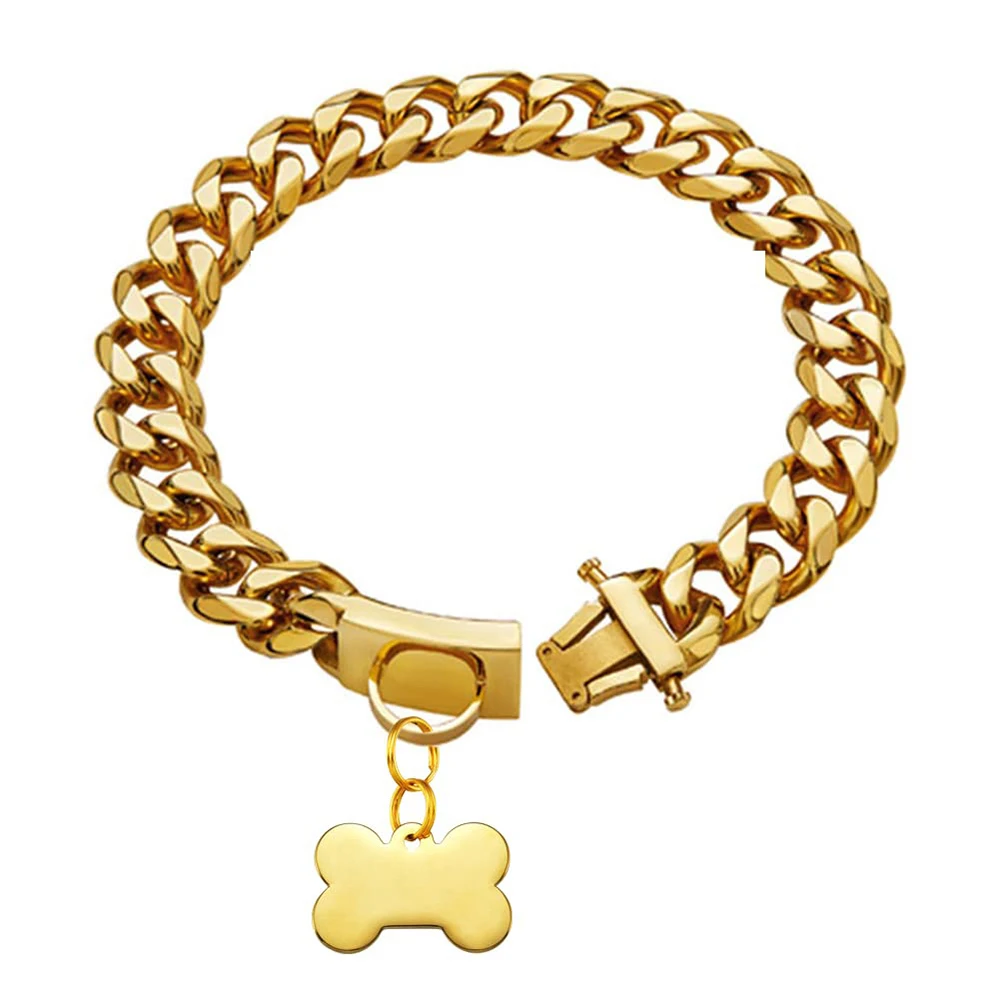 Gold Dog Collar Stainless Steel Cuban Link Chain with Bone ID Tag, Luxury Pet Necklace, Small Medium Large Dogs Usage